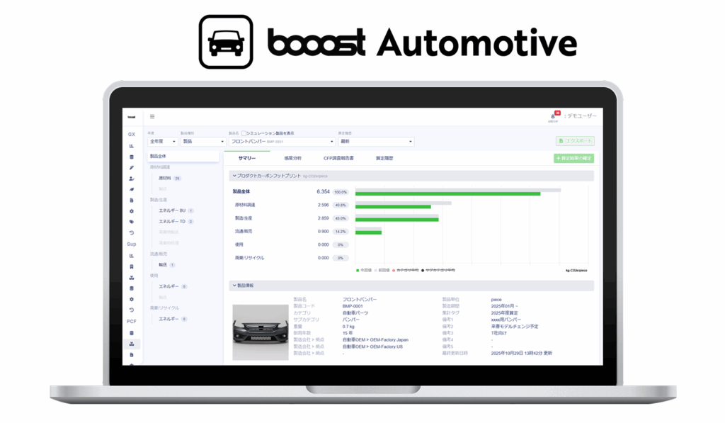 booost Automotive は、国際規制の動向や自動車産業特有のサプライチェーン課題に対応するために開発された、業界初の統合型ソリューションです。製品単位 (Product-level) の精緻なPCF算定と、組織単位 (Corporate-level) のGHG・開示管理を一体で実現し、国際基準に準拠した比較可能なデータマネジメントを可能にします。