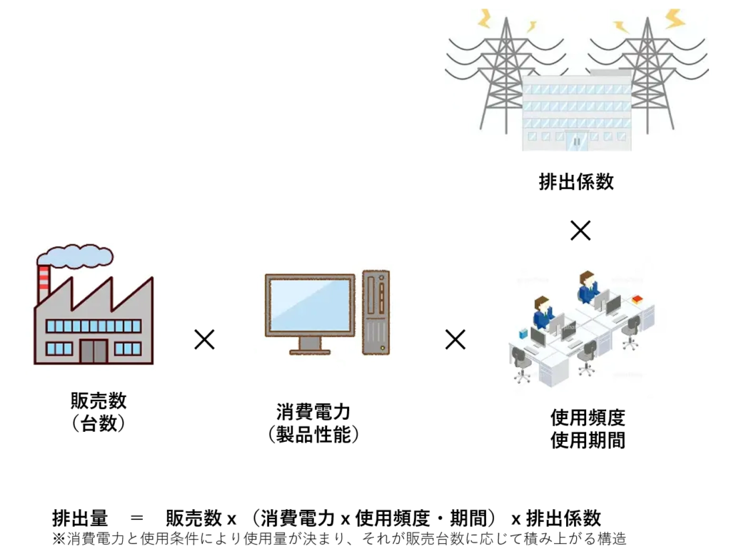 「製品の消費電力や燃費 × 使用頻度・期間 × 販売台数 × 排出係数」