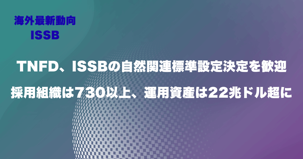 TNFD、ISSBの自然関連標準設定決定を歓迎 – 採用組織は730以上、運用資産は22兆ドル超に