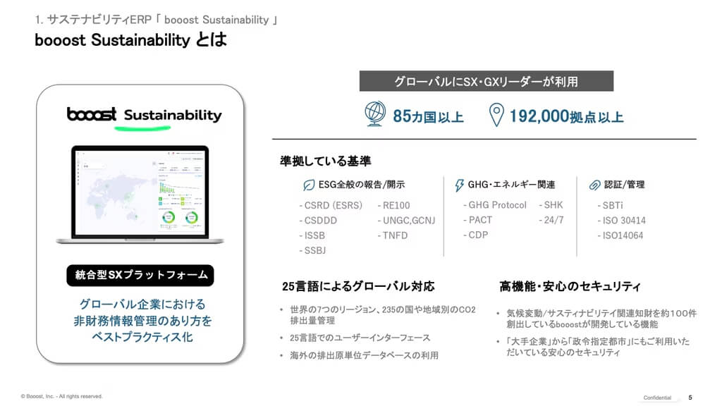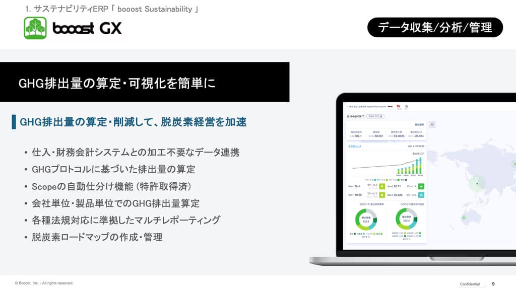 「booost GX」は、”GHG排出量の算定・可視化を簡単に” できるサービスです。 GHG排出量の算定・削減を効率化し、脱炭素経営を加速させます。